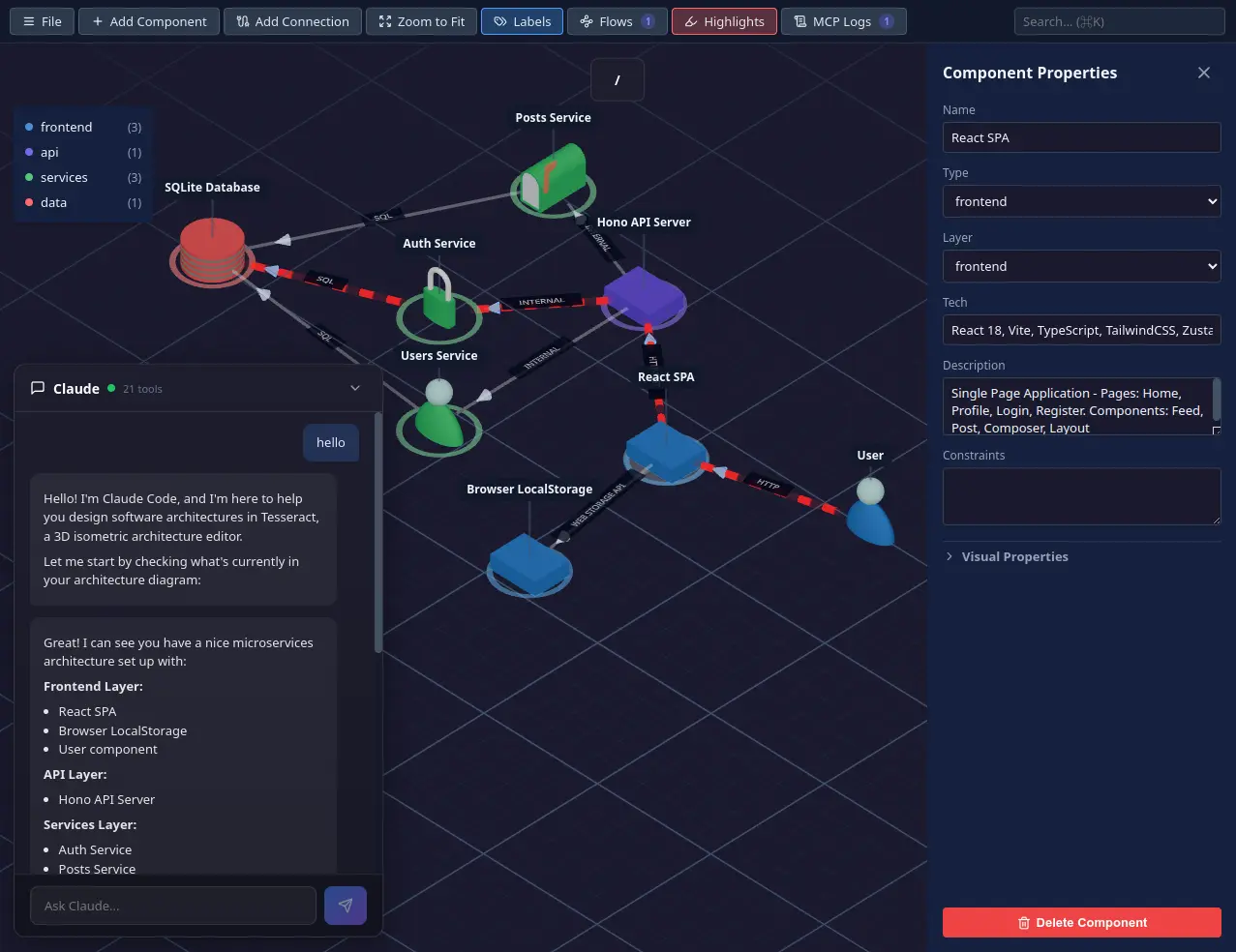 Tesseract is a 3D architecture editor that connects to Claude AI. Visualize your codebase, design systems, and document data flows — together with your AI assistant.